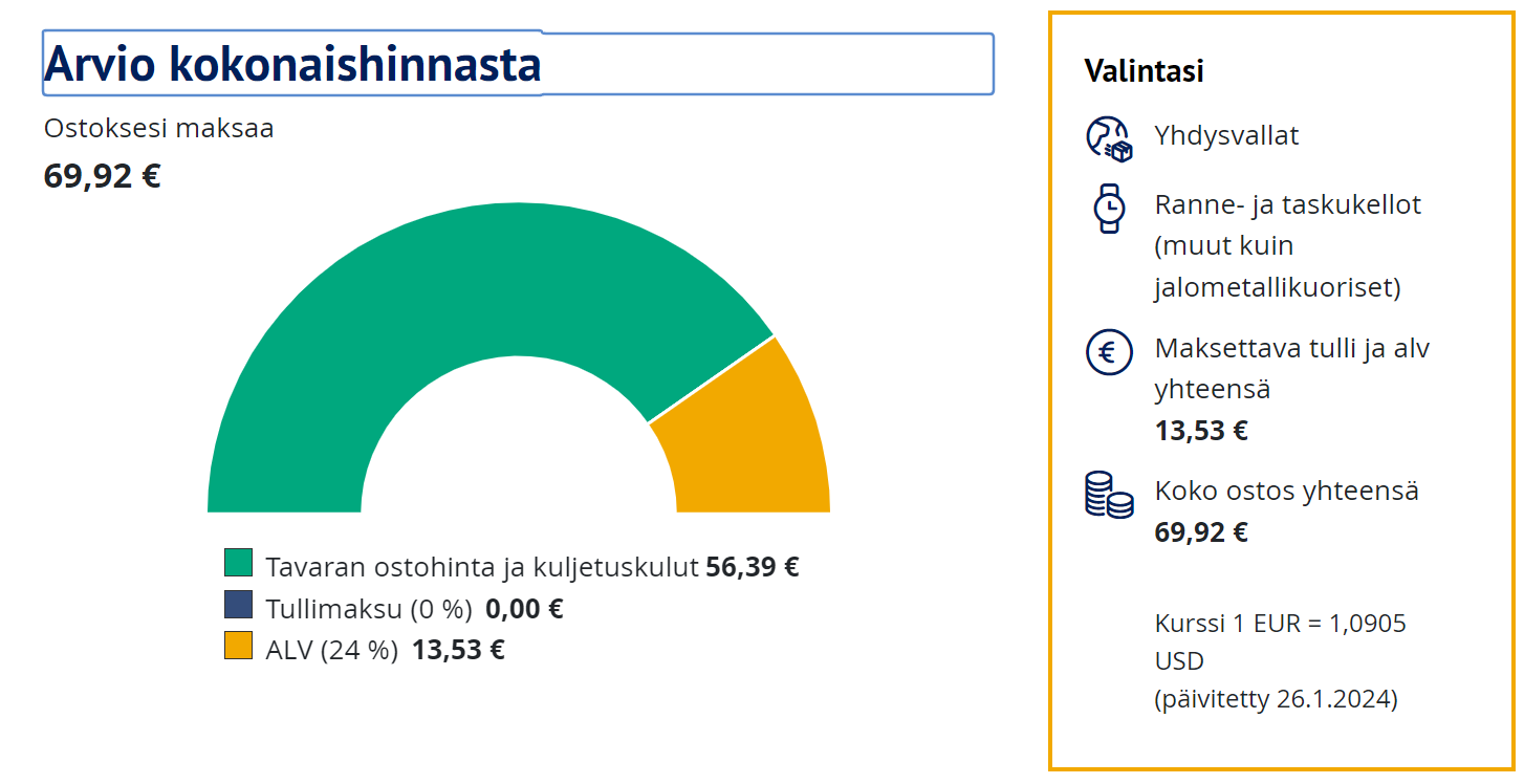 Esimerkkinä kyseinen Casio Duro maksaa Amazon.comissa 46.33 dollaria ( 50,50 euroa) ja lähetyskulut ovat 15,16 dollaria (16,52). Joudut maksamaan Tullille tuotteen ostohinnasta ja kuljetuskuluista arvonlisäveron eli 24% (13,53) Tullimaksua et joudu maksamaan. Maksat kellosta kaikkineen siis 69.92 euroa.